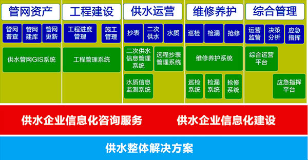 以GIS技術(shù)、計(jì)算機(jī)技術(shù)為基礎(chǔ),立足供水行業(yè),深入分析制水、供水、用水整個運(yùn)營過程,提供抄表、二次供水管理、水質(zhì)管理等功能的運(yùn)營信息系統(tǒng),實(shí)現(xiàn)對供水從源頭到龍頭的一體化監(jiān)管,保證城市飲用水的安全。